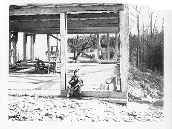 My daughter Jenny sits on the sill of the newly raised structure. A pile of chips two feet high, thirty feet long and twelve feet wide left from the beam making process is in the foreground.